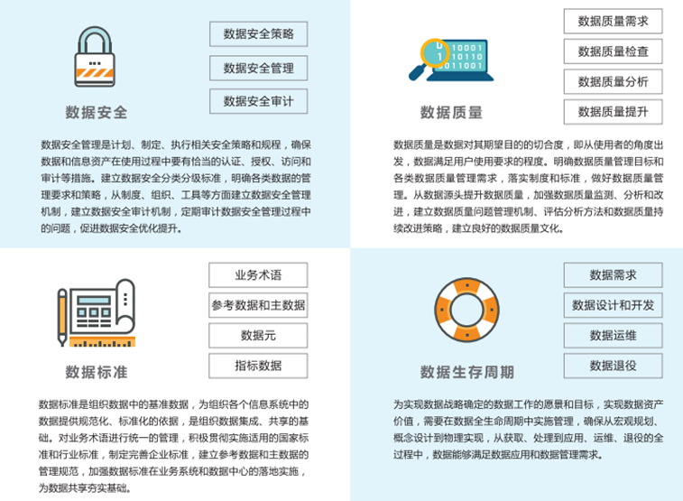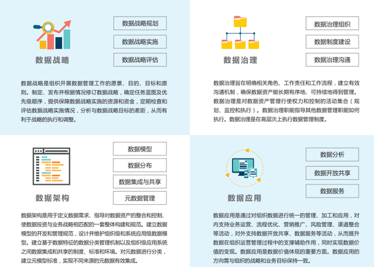 DCMM數(shù)據(jù)管理能力成熟度評(píng)估模型定義了數(shù)據(jù)戰(zhàn)略、數(shù)據(jù)治理、數(shù)據(jù)架構(gòu)、數(shù)據(jù)應(yīng)用、數(shù)據(jù)安全、數(shù)據(jù)質(zhì)量、數(shù)據(jù)標(biāo)準(zhǔn)和數(shù)據(jù)生存周期八個(gè)核心能力域及28個(gè)能力項(xiàng)445條標(biāo)準(zhǔn)進(jìn)行評(píng)估。